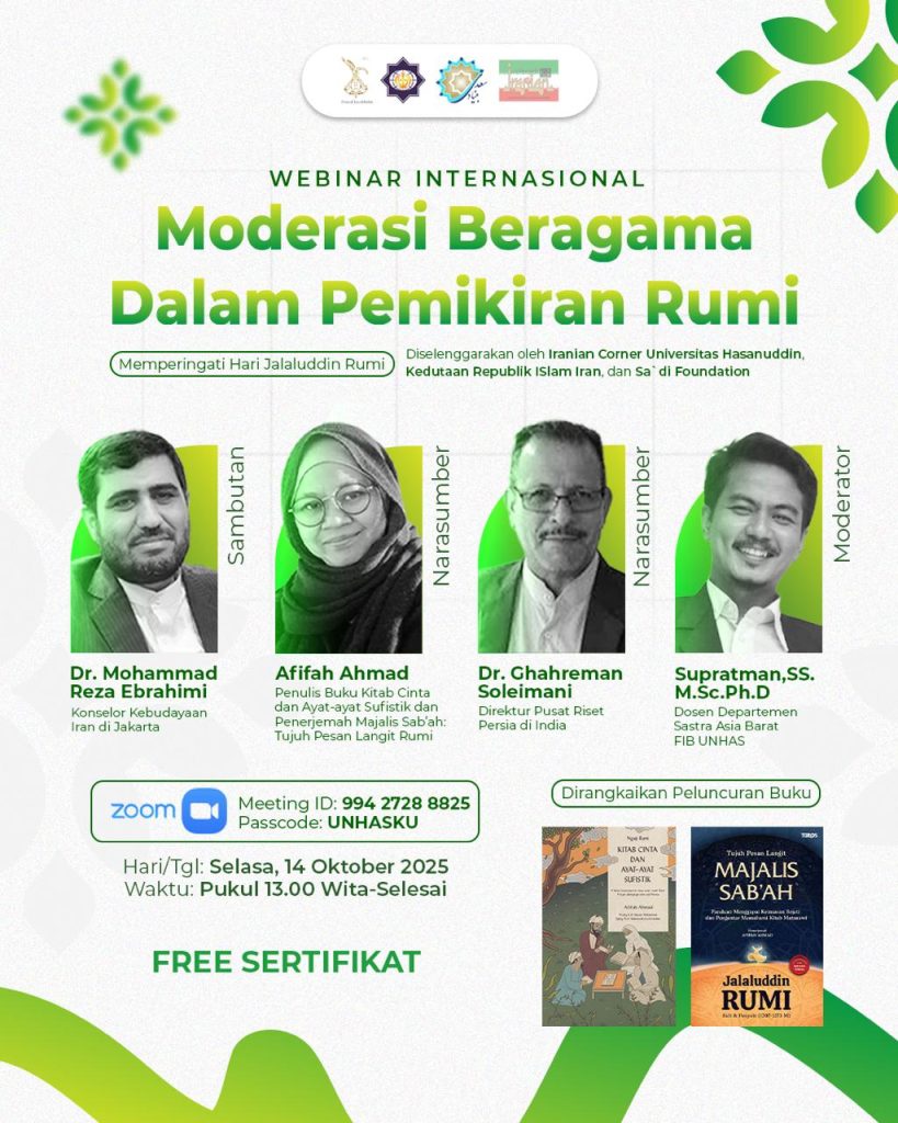 Dalam rangka memperingati Hari Rumi, Konsulat Kebudayaan Iran bekerjasama dengan Iran Corner UNHAS, Pusat Penelitian Bahasa Persia di India, Saadi Foundation dan Rumi Institute menyelenggarakan Webinar Internasional Moderasi Beragama dalam Pemikiran Rumi dirangkaikan dengan peluncuran buku: